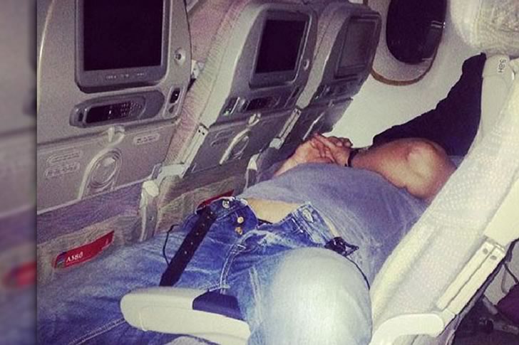 This photo perfectly captures the consequences of overindulging in alcohol during a long flight. The passenger is sprawled awkwardly across a row of economy seats, seemingly unconscious and totally unaware of his surroundings. With his seatbelt unbuckled, jeans half undone, and limbs positioned uncomfortably, everything about the scene suggests he had one too many drinks either before or during the flight. While hilarious at first glance, the image also raises questions about in-flight behavior and the importance of knowing your limits.
