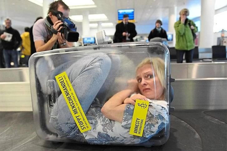 At first glance, this luggage appears to feature a bizarre 3D print—until you realize there’s actually a woman curled up inside it. It’s not a magic trick or an extreme method to avoid baggage fees. In fact, this eye-catching scene is part of a powerful visual campaign by Amnesty International to raise awareness about human trafficking. The image is meant to shock, and it certainly succeeds in grabbing attention from everyone at the terminal.