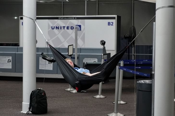 While most travelers pace the terminal or fight for a spot near an outlet, this passenger clearly knew exactly what he was in for. Armed with a portable hammock and the confidence of someone who’s endured more layovers than takeoffs, he turned two airport support columns into the ultimate lounge setup. His relaxed posture and removed shoes suggest a level of preparedness that only comes from hard-won experience.