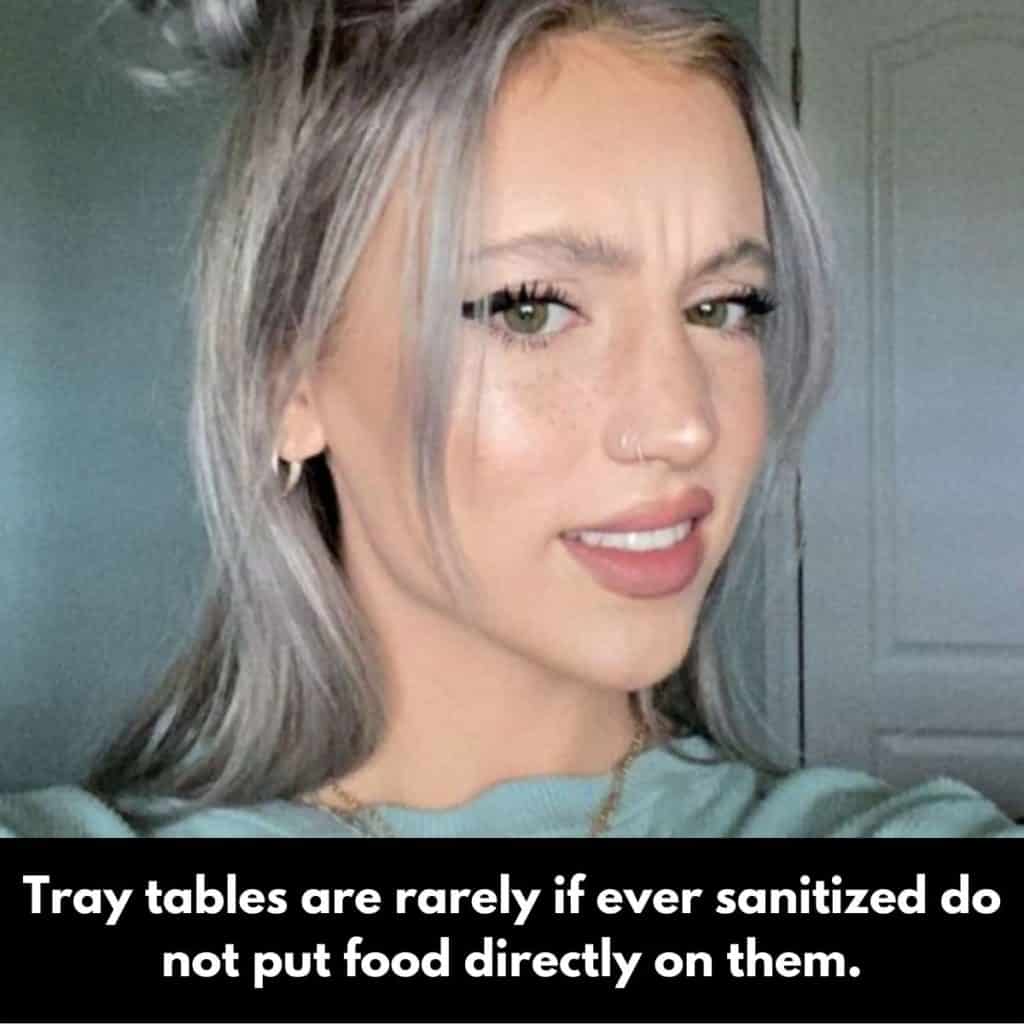 Y esto significa que no tienes idea de lo que ha sucedido recientemente en tu bandeja y no hay garantía de que haya sido limpiada en absoluto. Tal vez la última persona en este asiento vomitó en ella y luego simplemente la limpió con una servilleta y lo dio por bueno. Voy a empezar a viajar con toallitas desinfectantes.