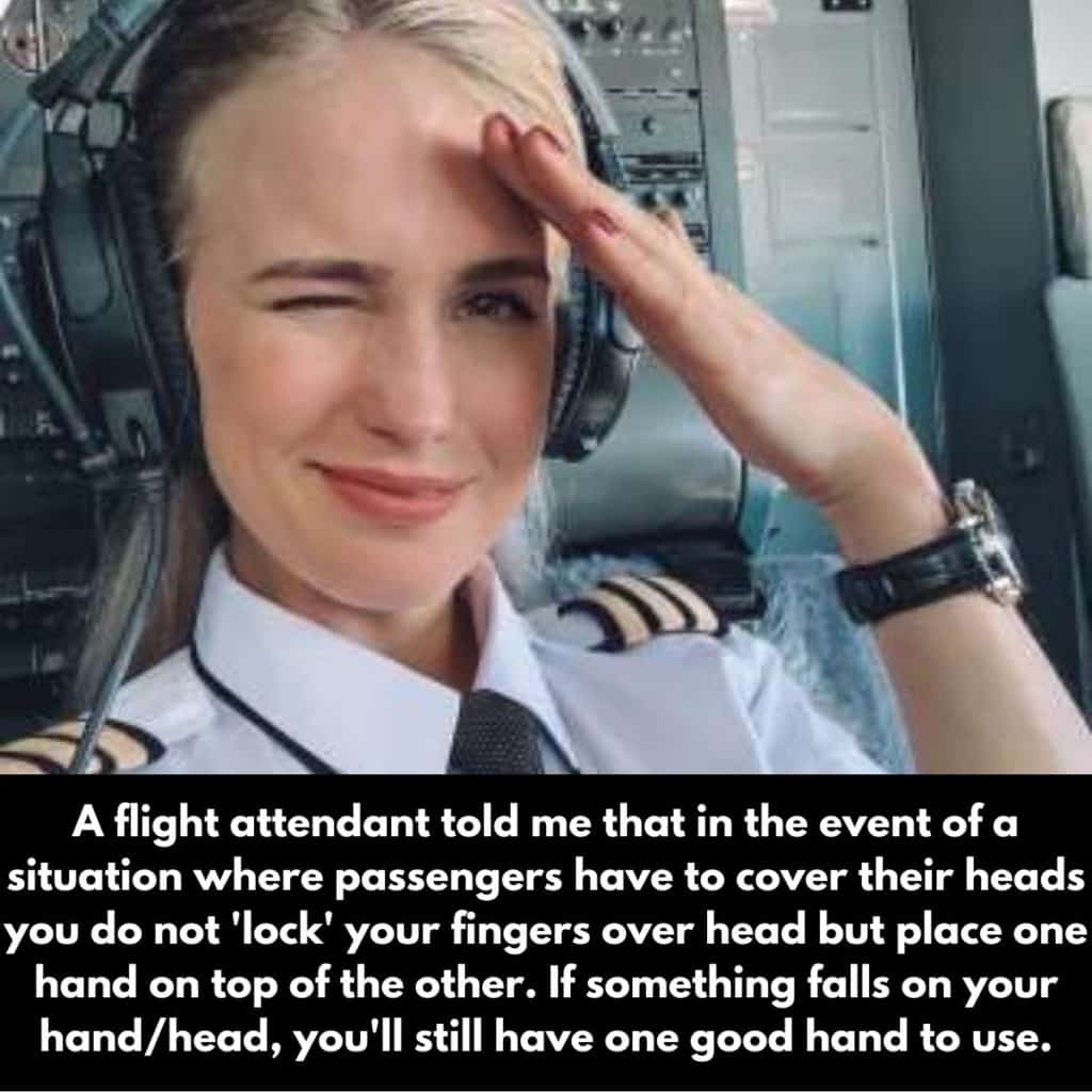 Así que me encanta este consejo. A todos nos han enseñado a poner las manos detrás de la cabeza cuando nos agachamos y nos cubrimos, pero si lo haces de tal manera que ambas manos queden expuestas a objetos que caen, podrías terminar con ambas heridas. Recordaré esto para el futuro (aunque espero sinceramente no tener que usarlo nunca).