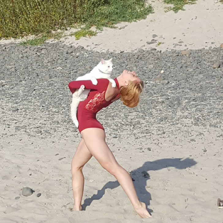If you’re a cat owner, you know cats have an odd fascination with sand. After all, it’s basically their natural litter box. But in this photo, sand meets elegance. A dancer strikes a beautifully poised pose on the beach, but all eyes are on Buns—the glorious, curious cat stealing the scene.
