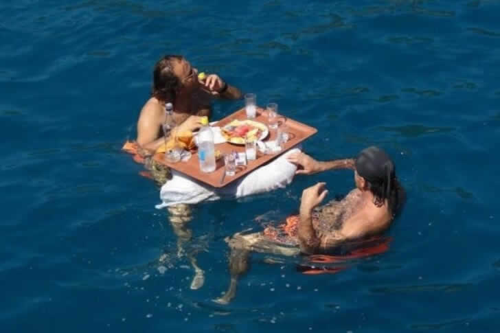 Picture this: two people floating peacefully on a tray of food, living their best snack life. Sounds idyllic, right? But it also looks suspiciously like the setup to a shark movie.