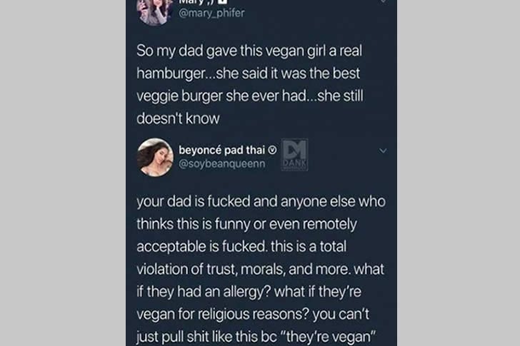 Si je lis végétalien, je suppose que le fromage est un substitut laitier, si je lis végétarien, je suppose qu’il n’y a pas de viande. Si c’est listé comme “pizza aux légumes”, je n’aurais pas supposé végétarien, mais juste qu’il n’y avait pas de viande. Franchement, c’était nul. Et je me rends compte maintenant que leur pizza végétalienne contient probablement aussi de la viande dans la sauce.