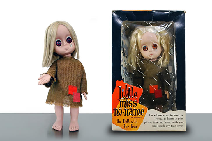 Hasbro’s Little Miss No-Name was marketed in 1965 as a doll designed to teach empathy—an orphan child doll with a forlorn expression, tattered clothes, and even a single painted tear. But kids weren’t comforted by her sorrowful face; many found her haunting and sad rather than lovable.