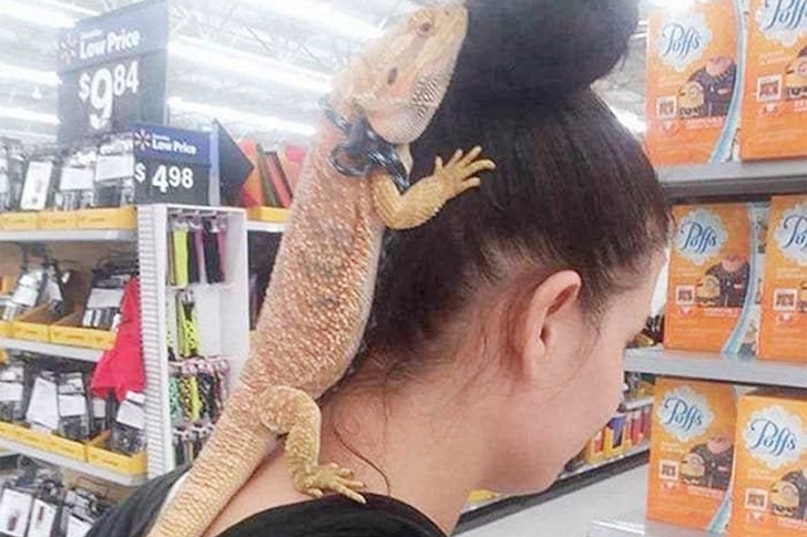 Manche Menschen können einfach nicht das Haus verlassen, ohne ihre Haustiere bei sich zu haben. Offensichtlich hat diese Frau beschlossen, ihre reptilische Freundin nicht alleine zu Hause zu lassen, während sie einkauft. Wenn wir die Eidechse an ihrem Kopf hängen sehen, könnten wir annehmen, dass sie unter Trennungsangst leidet. Während diese Szene für manche Käufer niedlich und faszinierend sein mag, ist sie für andere zweifellos beängstigend.