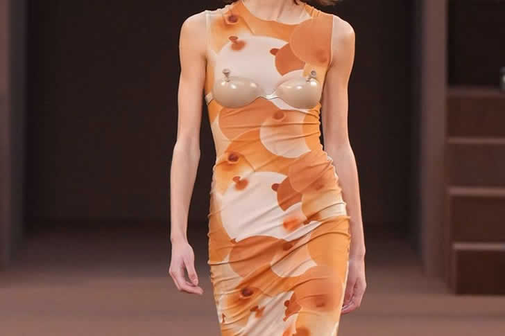Während die High Fashion gerne mit geometrischen Formen spielt, treibt dieser Look den „boxy“-Trend auf ein wörtliches, urkomisches Extrem. Es ist die ultimative Wahl für die Person, die wie ein Minecraft-Charakter aussieht, der eine gehobene Galerieeröffnung besucht. Man muss das Gleichgewicht des Models bewundern – es ist nicht einfach, eine solche Eleganz zu bewahren, während man im Wesentlichen ein Stück moderner Möbel trägt. Es ist eine witzige Erinnerung daran, dass Haute Couture manchmal mehr mit abstrakter Mathematik als mit tatsächlichem Komfort zu tun hat!