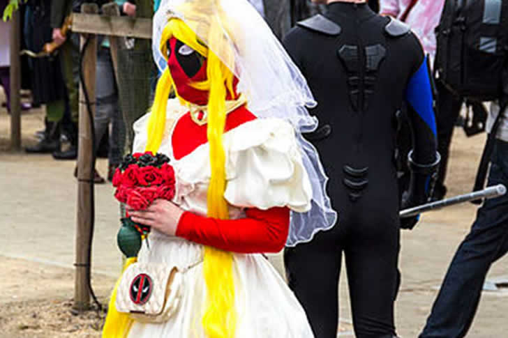 Zum Abschluss dieser Liste haben wir eine Braut gefunden, die ein großer Fan von Deadpool sein muss – so sehr, dass sie ihn zu einem wichtigen Teil ihres Hochzeitstages gemacht hat. Schauen wir uns dieses Hochzeitskleid genauer an. Der auffälligste Teil ist offensichtlich die Deadpool-Maske. Wir fragen uns, ob es für den Bräutigam schwer war, „Ja, ich will“ zu hören?