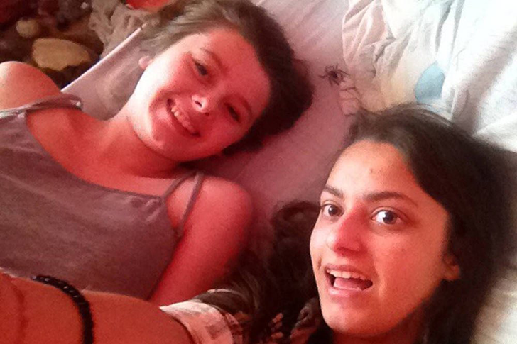 Während sie ein lässiges Selfie machen, sitzt eine riesige Spinne unbemerkt auf ihrem Kopf. Vielleicht “entspannt”, aber wir sind sicher, dass die Mädchen diese “Unterschrift” nicht wünschten. Ein Gruß, den man nicht einfach abschütteln kann.