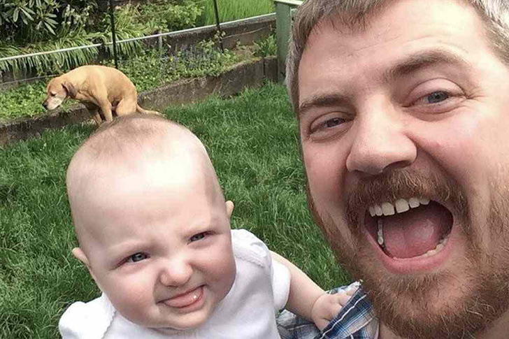 Wir glauben nicht einmal, dass ein professioneller Photoshop-Künstler diesen Hintergrund-Fotobomber entfernen könnte. Ja, es scheint, als ob auch der Hund dachte, er würde die wunderbare frische Luft nutzen und diesen günstigen Moment nutzen, um sich direkt hinter dem Vater und dem Baby zu erleichtern. Wir schätzen, man gewinnt manchmal und verliert manchmal.