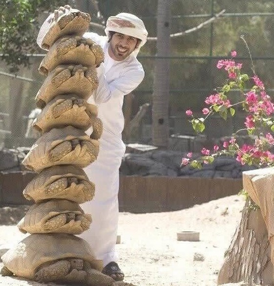 Schauen Sie sich diesen Mann an, der seinen Reichtum auf eine beeindruckende Art zur Schau stellt. Insgesamt besitzt er acht derartige Wüstenschildkröten. Die bedauerlichen, robusten Kreaturen wurden sogar übereinander gestapelt, nur um ein perfektes Foto zu machen.