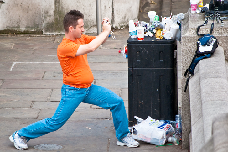 Was ist hier passiert? Okay, man möchte glauben, dass dieser Mann ein Foto von etwas im Müllhaufen macht, aber tatsächlich hat er einen tollen Moment im Müll eingefangen. Vielleicht hat er etwas Interessantes im Müll entdeckt, aber wir können nicht sagen, was er genau sucht oder warum er dort fotografiert.