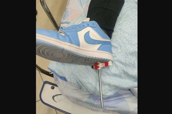 Dieser junge Patient trat auf einen Tischkicker-Stab, der Stab durchdrang seine Fußsohle, ging durch Schuh und Socke. Überraschenderweise war es die Plastikfigur, die den Stab davon abhielt, noch tiefer einzudringen.
