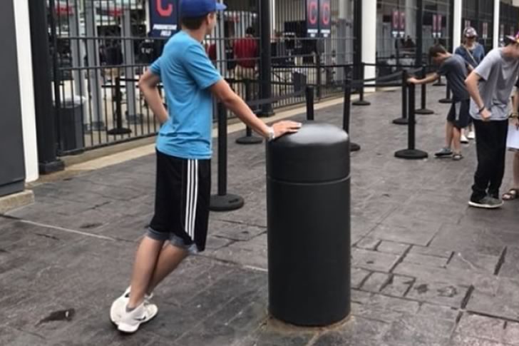 In einem scheinbar lässigen Moment vor einem Stadion scheint ein junger Mann die Gesetze der Physik herauszufordern. Er lehnt sich unmöglich weit nach hinten, während er sich an einem kurzen schwarzen Pfosten festhält, und scheint gerade zu fallen – nur ist er völlig entspannt, als würde er in einem normalen Winkel stehen. Diese visuelle Illusion ist verblüffend und urkomisch zugleich und versprüht in einer sehr alltäglichen Umgebung starke „cooler Typ macht Science-Fiction“-Energie.