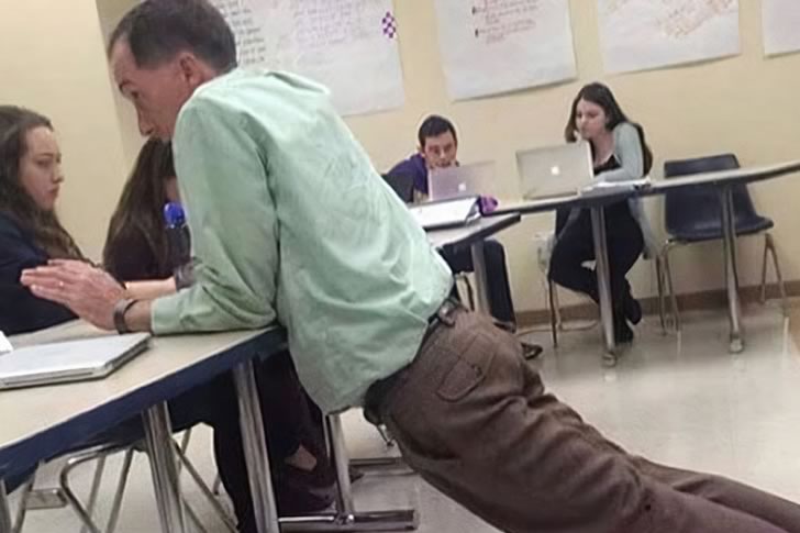 Dieses Bild zeigt einen Mann, der mitten im Gespräch die Gesetze der Körperhaltung neu zu definieren scheint. Mit seinem Körper, der wie ein lebendiges Brett ausgestreckt ist, lehnt er sich über einen Tisch, um mit Studenten in der vielleicht dramatischsten Lehrhaltung, die je aufgenommen wurde, zu interagieren. Seine Füße sind weit hinter ihm platziert, was den Eindruck erweckt, als würde er einen stehenden Liegestütz machen, während er beiläufig plaudert. Es ist, als hätte er keinen Stuhl gefunden und beschlossen, dass die Schwerkraft es schon richten würde.