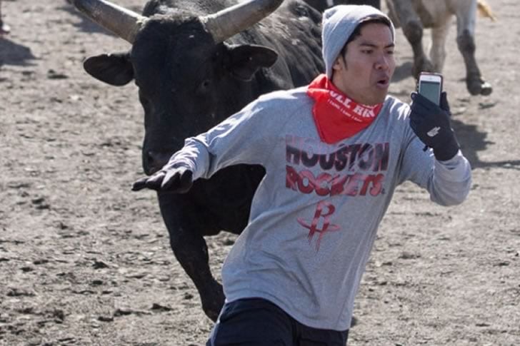 Dieses Bild fängt einen aufregenden Moment ein, in dem ein Mann ein extremes Selfie macht, während er bei einem chaotischen Lauf von einem Stier gejagt wird. Mit einem Houston-Rockets-Shirt und einem roten Kopftuch hält er sein Handy ruhig, während die Hörner des Stiers gefährlich nah hinter ihm sind. Die staubige Arena und die Läufermenge tragen zur intensiven Atmosphäre bei und machen dies zu einem aufregenden Beispiel waghalsiger Fotografie.
