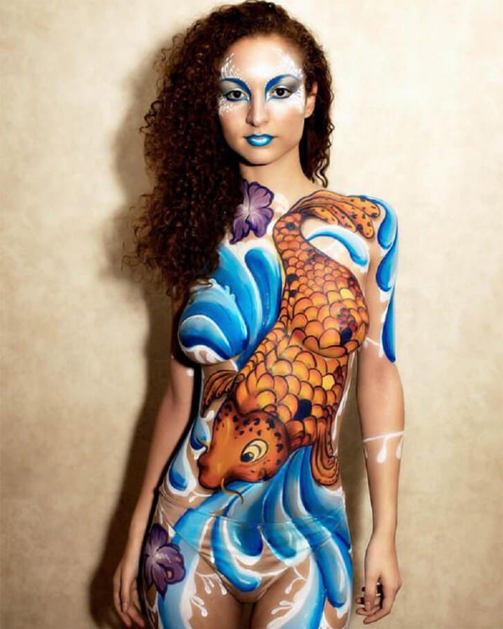 Es scheint, dass Koi-Karpfen eine äußerst beliebte Wahl für Körperkunst sind. Diese Fische, die heutzutage in Japan mit Stolz und Freude gezüchtet werden, haben vermutlich ihren Ursprung im frühen 19. Jahrhundert. In dieser Zeit begann man, Koi-Karpfen gezielt für Wettbewerbe zu züchten. Die Farbpalette dieser Fische erstreckt sich von Orange über Weiß, Gelb und Braun bis hin zu Blau.