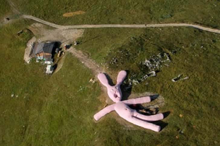 Angst vor einem rosa Hasen? Noch gruseliger ist er, wenn er riesig ist und sich auch noch grau verfärbt und verwest. Dieser gigantische Hase wurde 2005 als Kunstinstallation auf einem Hügel des Colleto Fava in Norditalien platziert. Ursprünglich war er beeindruckende 60 Meter lang und 6 Meter hoch. Der Hase wirkt, als sei er vom Himmel gefallen, wobei seine “Innereien” scheinbar herausquellen.