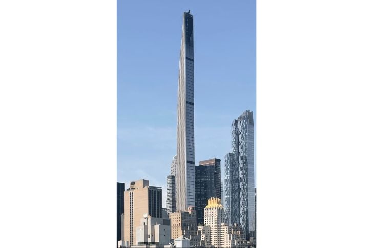 Dieser Turm, bekannt als der dünnste Wolkenkratzer der Welt, mit435,3 MeternHöhe und84 Stockwerken, wurde2021inNew York City, USA, fertiggestellt.