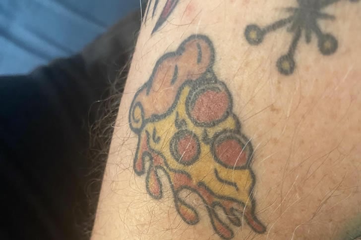 Pizza-Tattoos sollten eigentlich Spaß machen und einem das Wasser im Mund zusammenlaufen lassen, aber dieses hier sieht eher aus wie geschmolzener Käse mit zufälligen roten Klecksen auf einem verbrannten Teigboden. Das „Pepperoni“ ist nicht zu erkennen, und das gesamte Tattoo ähnelt eher einem missglückten abstrakten Kunstwerk. Anstatt den Appetit anzuregen, sorgt es eher für Verwirrung.
