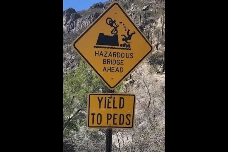 36. Warnschild für Radfahrer auf den schmalen Steinbrücken im Sabino Canyon, Arizona
