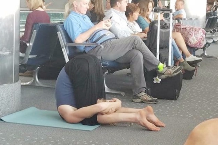 Am liebsten würde man sich einmal richtig strecken, doch der begrenzte Platz an Bord macht dies unmöglich. Dieser passionierte Yogi nutzte daher die Wartezeit am Flughafen für seine Übungen – mitten im öffentlichen Bereich.