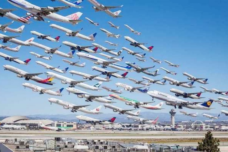 Zum Glück ist dies keine reale Situation. Der Fotograf Mike Kelley schuf dieses Kompositbild aus 400 Einzelaufnahmen unter dem Titel “Wake Turbulence”. Es zeigt sämtliche Starts am internationalen Flughafen LAX in Los Angeles.