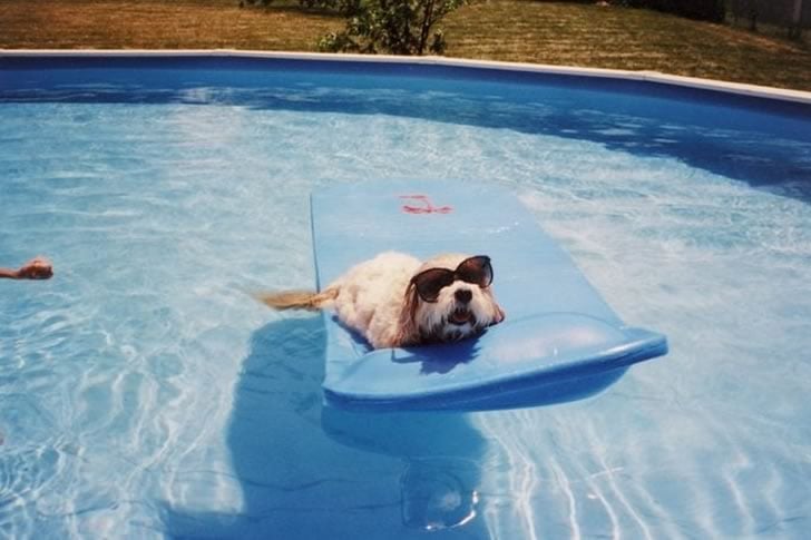 Ein kleiner weißer Hund entspannt sich auf einer blauen Pool-Schwimmhilfe und trägt eine winzige Sonnenbrille für den besonderen Pfiff. Im klaren Wasser in entspannter Pose treibend, sieht der Hund aus, als würde er einen luxuriösen Urlaub genießen. Die sonnige Gartenkulisse unterstreicht die sommerliche, unbeschwerte Stimmung dieser amüsanten Szene.