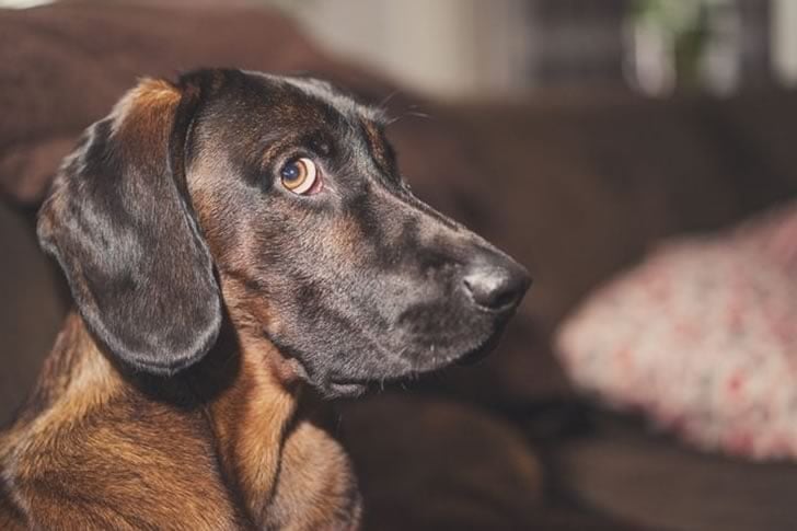 Dieser braun-schwarze Hund sitzt auf einem gemütlichen Sofa und blickt mit großen, unschuldigen Augen zur Seite, die jede Art von Unfug abzustreiten scheinen. Die sanfte Beleuchtung und die plüschige Umgebung verleihen dem Ganzen eine humorvolle Note, als ob der Hund posieren würde, um die Schuld für ein kürzliches Chaos zu vermeiden. Mit seinen aufgestellten Ohren und einem leicht schuldigen Ausdruck ist es schwer, nicht über die Vorstellung zu lachen, dass dieser Welpe völlig harmlos sein könnte, was ihn zu einem perfekten Aufmunterer für jeden macht, der ein Lächeln braucht.