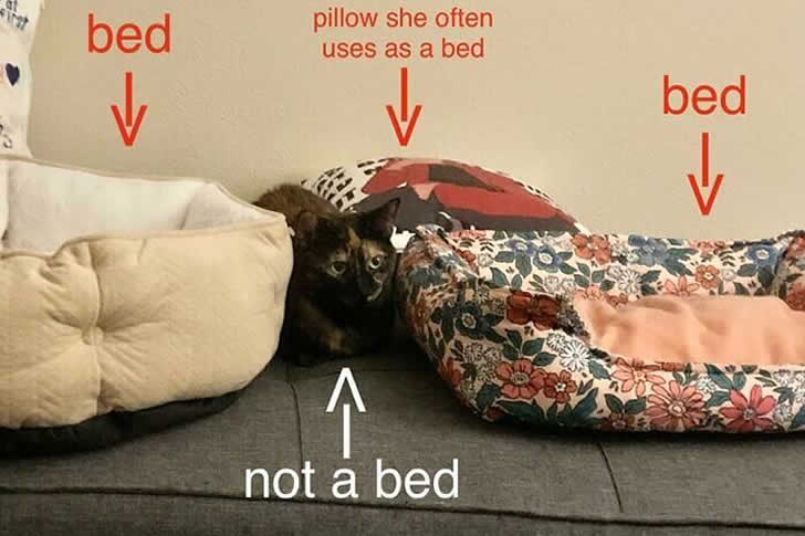 Es ist nichts Persönliches (wahrscheinlich). Manche Katzen bevorzugen einfach seltsame und unbequeme Orte, um ihr königliches Haupt zu betten. Vielleicht mögen sie keinen Luxus. Vielleicht haben sie Spaß daran, dich zu verwirren. Auf jeden Fall sind diese teuren Betten… für dich, nicht für sie.