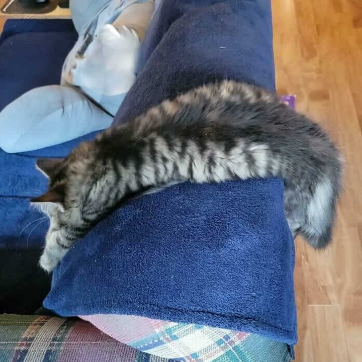 Wir alle hatten schon diese Tage, an denen wir einfach… die Luft rauslassen. Diese Katze erlebt gerade so einen Moment, ausgestreckt wie eine Pfütze auf dem Sofa, als hätte sie komplett darauf verzichtet, eine Struktur zu haben. Sie sitzt nicht. Sie liegt nicht. Sie ist verschüttet.