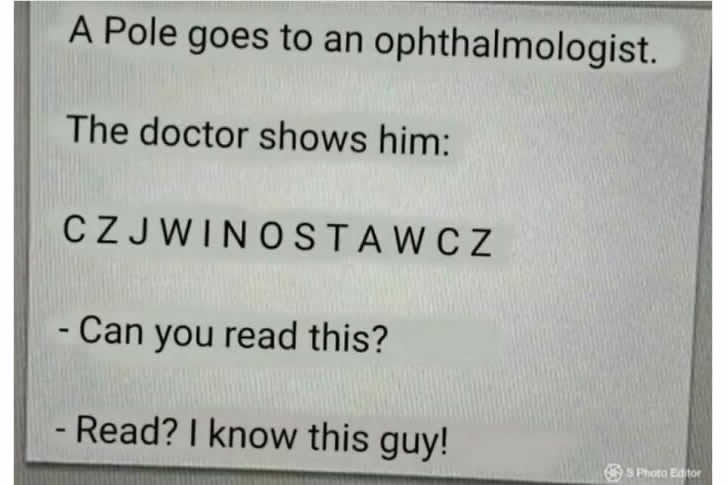Das Meme beginnt mit einem einfachen Witz über Polen, da sie sehr lange Namen haben. Wir sehen einen Polen, der seine Augen untersuchen lässt, und der Arzt zeigt ihm eine Reihe zufälliger Buchstaben, um zu prüfen, ob er sie lesen kann.