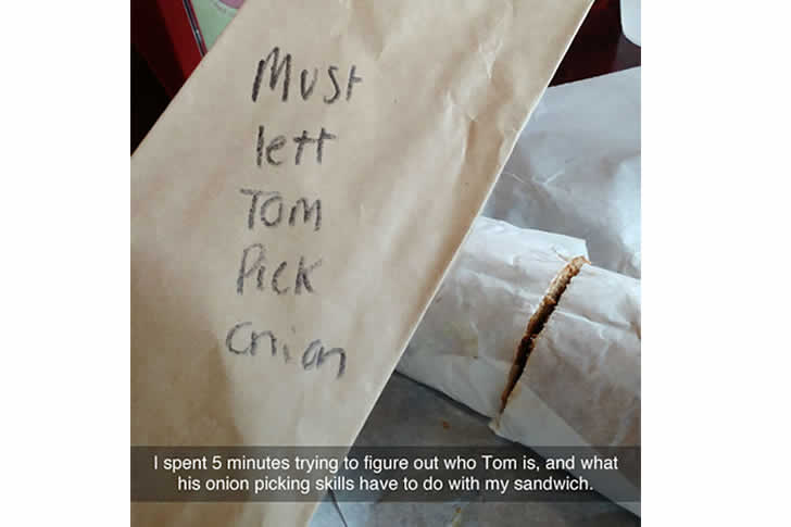 Das ist eigentlich ein Sandwich, und die Aufschrift auf der Verpackung listet lediglich die Zutaten auf. Da es sich wahrscheinlich um eine Sonderbestellung handelte, notierten die Mitarbeiter die Zutaten, um sicherzustellen, dass es korrekt zubereitet wurde.