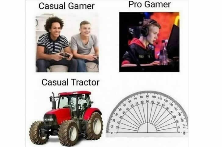 Hier sehen wir ein klares Wortspiel, das auf der Idee eines „Gelegenheitsspielers“ (casual gamer) im Vergleich zu einem „Profi-Spieler“ (pro gamer) aufbaut. Das Meme erweitert diesen Vergleich, indem es einen „Gelegenheits-Traktor“ neben einem Bild eines „Profi-Traktors“ zeigt, der eigentlich einWinkelmesserist. Der Humor entsteht, wenn das WortWinkelmesserin „Pro“ und „Traktor“ aufgeteilt wird, wodurch es wie eine fortschrittlichere oder professionellere Version eines Traktors aussieht.