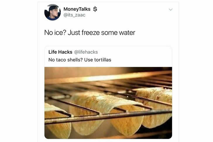 Deshalb ist das eigentlich gar kein Hack, sondern nur die Feststellung von etwas sehr Offensichtlichem. Aus diesem Grund antwortet die Person darunter mit einem weiteren „Hack“ und schlägt vor, dass man, wenn man kein Eis hat, einfach Wasser einfrieren sollte. Diese Antwort ist eindeutig sarkastisch und soll den ursprünglichen Vorschlag verspotten, indem sie aufzeigt, wie unnötig und offensichtlich er war.