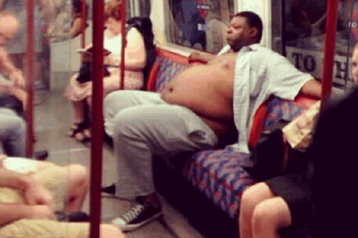 Schauen Sie sich diesen rundlichen Herren an! Er sieht aus, als ob er sich in den eigenen vier Wänden entspannt, Oberkörper frei und Bauch ganz herausgestreckt. Die Hände? Nonchalant über den Stuhl drapiert. Ja, der fühlt sich pudelwohl! Aber Leute, denken Sie daran – in der Öffentlichkeit ist etwas mehr Anstand gefragt.