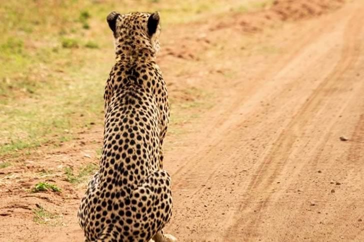 Ein Gepard sitzt gelassen auf einer staubigen Straße und blickt auf ein Geschwindigkeitsbegrenzungsschild mit der Aufschrift „40“, als stünde er kurz davor, wegen seiner blitzschnellen Sprints einen Strafzettel zu bekommen. Die gelassene Haltung der gefleckten Katze und das unerwartet menschenähnliche Szenario erzeugen eine humorvolle Wendung, die Wildnis und Alltag miteinander verbindet. Der warme, verschwommene Hintergrund aus Gras und Büschen trägt zur spielerischen Absurdität dieses Moments bei und macht ihn zu einer entzückenden Überraschung.