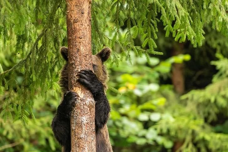 Die Comedy Wildlife Photography Awards lieben es, die spielerischen Momente der Natur zu präsentieren, und dieses Bärenjunge passt perfekt dazu. Sein Versuch, sich hinter dem Baum zu verstecken, wobei nur seine neugierigen Augen sichtbar sind, fühlt sich an wie ein Kinderspiel, das in die Wildnis verlegt wurde. Die Szene fängt den unschuldigen Charme des Jungtieres ein, sorgt für ein unbeschwertes Lachen und erinnert uns daran, wie selbst junge Bären entzückend albern sein können.
