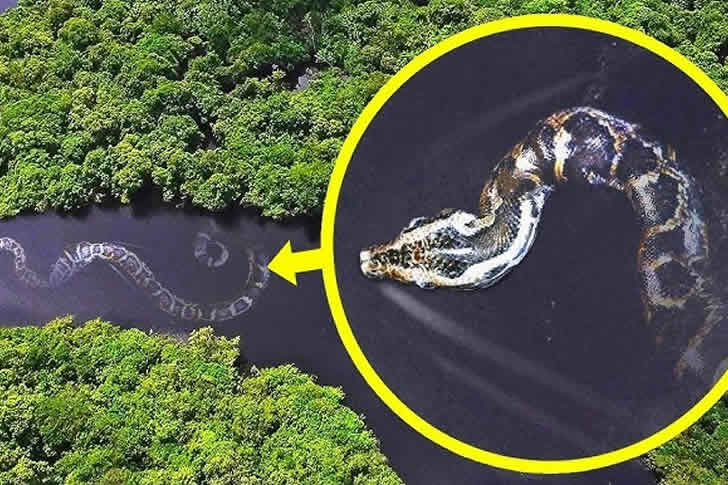 南国の密林を流れる川面に、高空から捉えられた巨大なヘビの姿が広がっています。この写真は、自然の驚異と神秘を象徴する一瞬を切り取ったもので、ヘビの長さは数十メートルに及び、その模様はまるで古代の神話に登場する怪物のように見えます。川の暗い水面を滑るように移動するその姿は、まるで生きる伝説がそこに息づいているかのような迫力を放ち、緑のジャングルとのコントラストが一層その存在感を際立たせています。