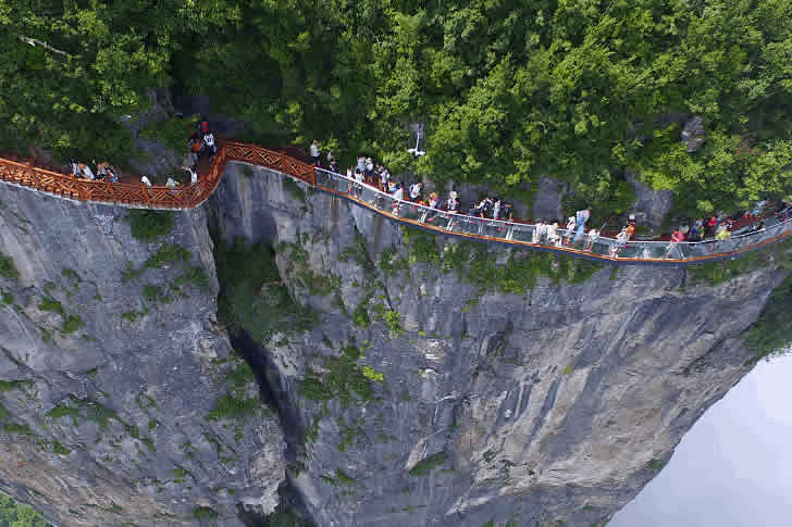 切り立った崖の側面に設置された吊り橋を、多くの観光客が渡る瞬間が高空から撮影されています。この写真は、人間の冒険心と自然の壮大さを映し出した神秘的な一瞬で、崖の岩肌に沿って伸びる吊り橋が、緑豊かな森林と深い谷の間に架かる様子が圧倒的な迫力を放っています。霧が谷底を覆い、吊り橋が雲海の上に浮かんでいるような幻想的な雰囲気を醸し出しています。
