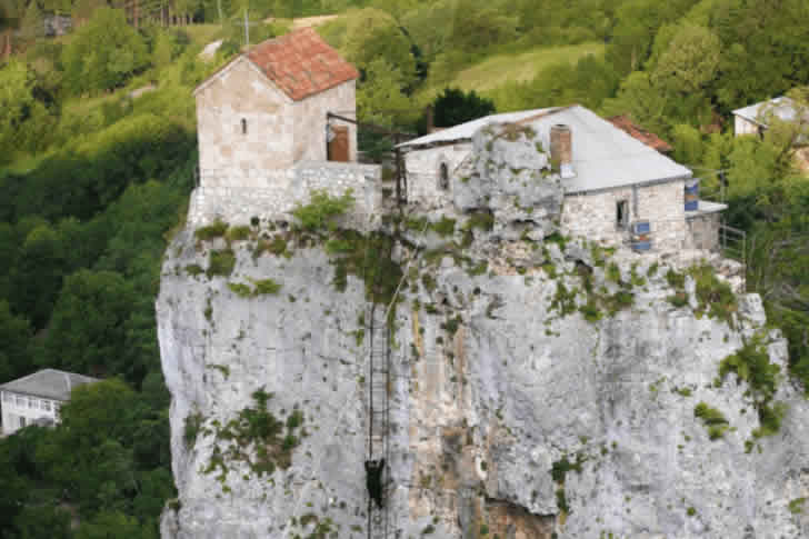 セルビアの山奥にそびえるカツカニクの岩山に、小さな修道院が神秘的な姿を見せています。この岩の頂上に建つパルテノン修道院は、14世紀から存在し、切り立った崖の上に佇む姿がまるで天空に浮かんでいるかのようです。木製の梯子が岩肌に沿って伸び、修道士たちが長い年月をかけてこの聖地を守ってきた様子が伺えます。緑豊かな森に囲まれたこの場所は、時の流れを忘れさせるような静寂と神聖さに満ちています。