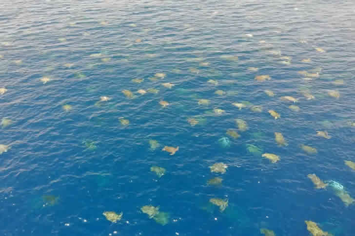 Es posible que estas tortugas marinas estén en medio de un largo viaje en busca de alimento o para desovar. Su nado en grupo simboliza los lazos y la convivencia en el mundo natural, brindando una serena emoción a quienes lo observan. Con el tiempo, las tortugas marinas se desvanecieron nuevamente en las profundidades del océano, y el vasto mar volvió a estar envuelto en silencio.