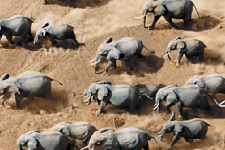 Una manada de elefantes se desplaza por la árida sabana, capturada desde las alturas. Esta fotografía es un instante místico que captura la grandiosidad de la naturaleza y la fuerza de la vida, con decenas de elefantes avanzando y levantando polvo, irradiando una presencia abrumadora. Entre la manada de elefantes también se mezclan crías, y la imagen de las familias moviéndose juntas simboliza los lazos del mundo natural, mientras que el contraste con la vasta tierra resalta su escala.