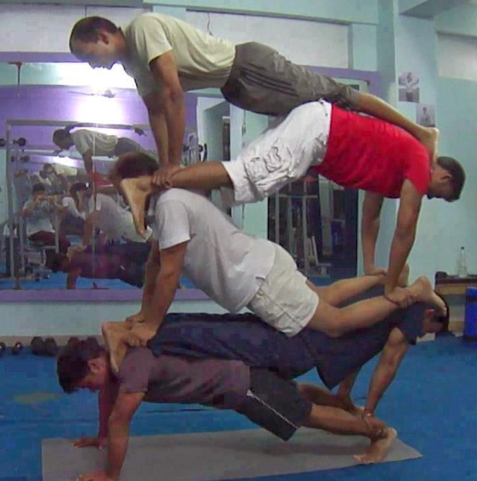 Teamwork makes training more effective—but these four have taken the group exercise thing a little too literally! While normal athletes train with dumbbells, they’ve decided to become the equipment themselves. This acrobatic pyramid is either a stroke of genius in training innovation or an accident waiting to happen.