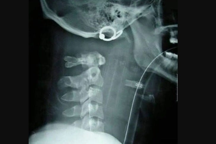 Lo más probable es que esta persona haya recibido un impacto en la mandíbula inferior, lo que resultó en la separación de la columna vertebral del cráneo, o fue ahorcada por el cuello desde una altura. La decapitación interna es una muerte instantánea.