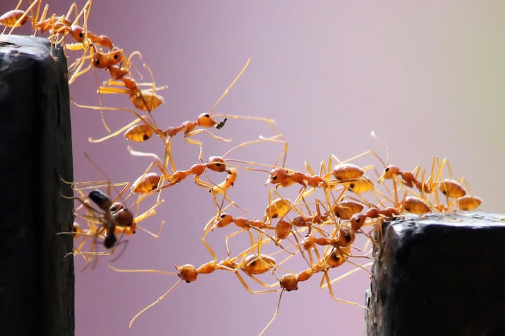 Las hormigas legionarias no solo marchan, sino que también son ingenieras. Cuando se enfrentan a huecos o terrenos difíciles, crean puentes vivientes usando sus propios cuerpos. Estas estructuras de hormigas pueden extenderse sobre el aire, el agua o las hojas, y se forman y ajustan en tiempo real a medida que la colonia avanza.