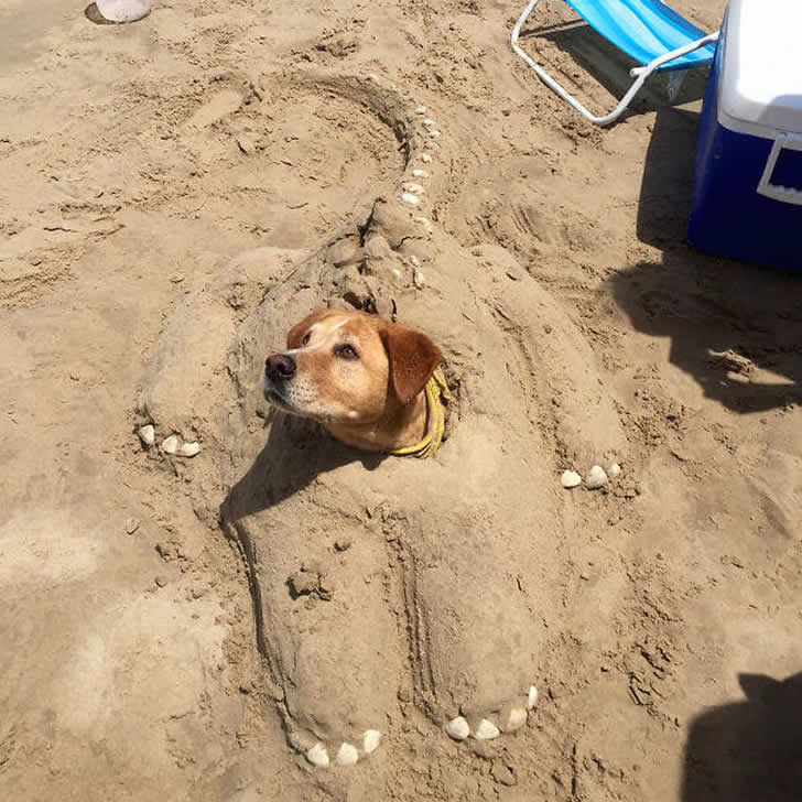Este buen chico se merece una medalla a la paciencia. Enterrado en la arena con solo la cabeza asomando, el resto de su cuerpo ha sido esculpido artísticamente como el de un dinosaurio.