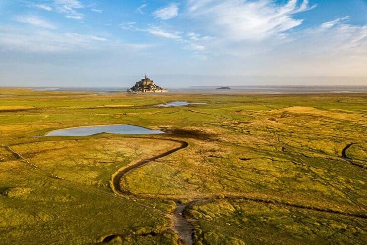 Visto desde arriba, el monasterio que se eleva desde el mar parece sacado de un cuento de hadas, con sus torres medievales y la isla rodeada por la marea, creando una apariencia casi mística.