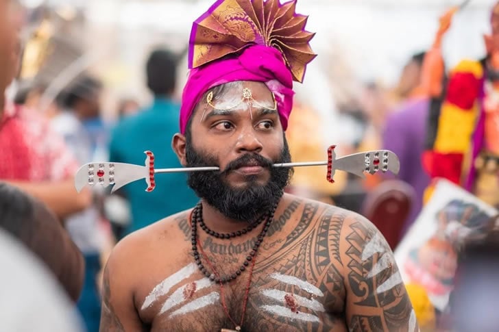 En uno de los festivales religiosos más intensos del mundo, los devotos tamiles se perforan el cuerpo con ganchos, brochetas e incluso pequeñas lanzas como acto de devoción. Celebrado predominantemente en Malasia y Singapur, el Thaipusam honra al Señor Murugan. Los devotos a menudo llevan grandes estructuras ceremoniales llamadaskavadimientras caminan durante kilómetros, algunos arrastrando el kavadi usando ganchos incrustados en su piel.