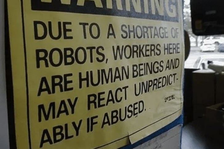 Mientras tanto, el personal de este lugar ha dejado señales de advertencia para recordarles tanto a los clientes como a los empleadores una verdad importante: no son ordenadores. Son humanos y, como todos nosotros, son propensos a cometer errores. Así que, practiquemos un poco la paciencia hasta el día en que los robots finalmente se apoderen de nuestros trabajos. Hasta entonces, la amabilidad y la comprensión son de gran ayuda.